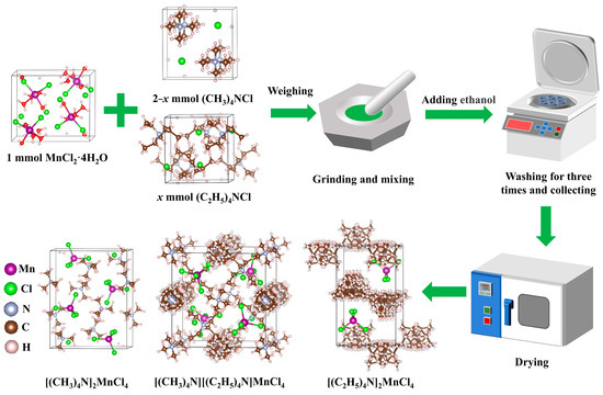 Tetramethylammonium chloride ((CH3)4NCl, 98%), manganese (II) chloride tetrahydrate (MnCl2·4H2O, 99%), ethanol (C2H5OH, 99.5%), and tetraethylammonium chloride ((C2H5)4NCl, 98%) were acquired from Shanghai Aladdin Biochemical Technology Co., Ltd., Shanghai, China. No further purification was carried out on any of the chemical reagents.