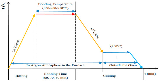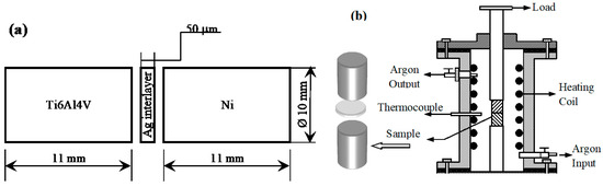 Chemical contents of Ti6Al4V material is presented in Table 1. Test samples used in diffusion welding need to have their connection surfaces shielded from oxidation and corrosion. The test specimens were fused together using an Ag interlayer and the diffusion welding technique. As an interlayer (bonding aid), pure Ag (99.00%) with foil thickness of 50 µm and foil hardness of 120 HV was utilized to promote comparatively smooth and uniform surfaces and inhibit development of the brittle phases between powder metallurgy components. Parts were able to diffusely bind under continuous pressure for varying times and temperatures. The process of diffusion welding was carried out in an argon-protected environment for 60 min at 850, 900, and 950 °C under a constant pressure of 5 MPa (Table 2). A schematic depiction of the diffusion bonding equipment is presented in Figure 2.
