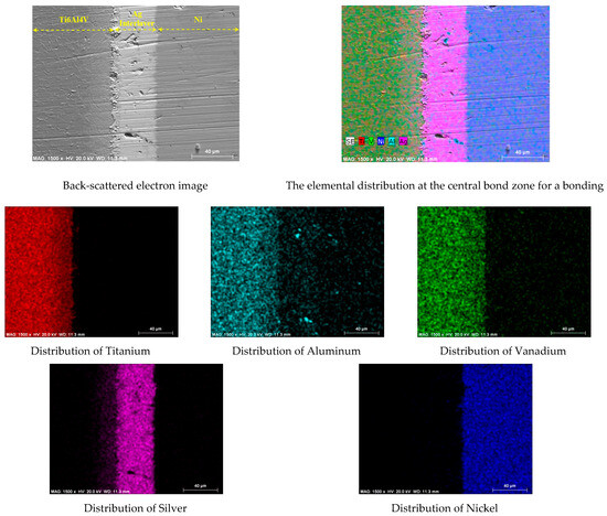 To further investigate the interface microstructure, the sample assembled at 850 °C was carefully observed by SEM in backscattered electron mode. The SEM image of the samples, the distribution image of the silver interlayer in the main materials, and the mapping of different important elements are exhibited in Figure 3. It can be seen that the silver interlayer shows rich dispersion on the Ti6Al4V side.