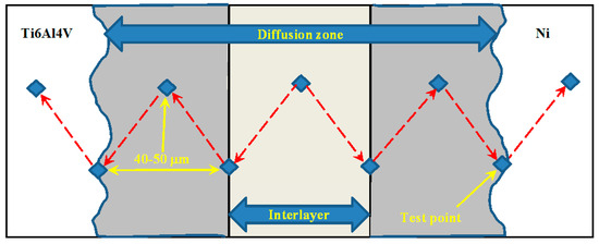 The test specimens were sliced perpendicular to the bonding interface to make the longitudinal microstructure analyses easier. After the cutting surfaces were ground, they were etched for metallographic analyses using an etching reagent (2 mL HF, 10 mL HNO3, and 88 mL H2O). Optical microscopy, SEM, EDS, and X-ray analysis were used to help with the metallographic tests and assessments. Using a Leica MHF-10 test device and an HV scale on both sides, microhardness values in the diffusion couples’ interface area were determined over the course of 20 s while a 10 g load was applied (Figure 3).