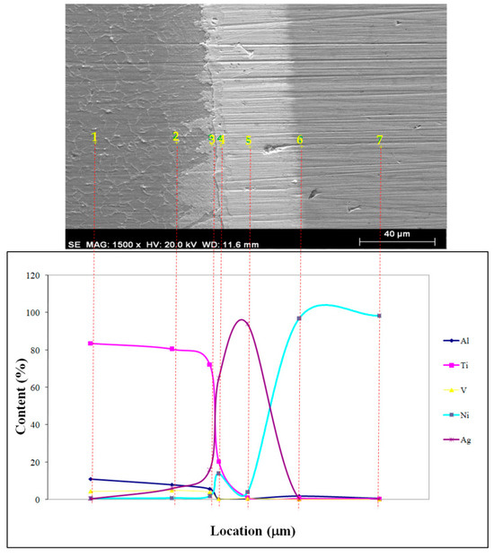 The Ti6Al4V alloy is widely used in many industries due to its high engineering properties [14]. However, the high production costs of Ti-based parts, processing difficulties, low plastic slip resistance, and poor wear resistance significantly limit their usage areas [15,16]. Numerous techniques have been developed for increasing the wear resistance of Ti6Al4V alloy [17,18,19]. Ag alloy has some advantages of excellent thermal and good electrical conductivity, low and stable contact resistance, high arc ablation resistance, and anti-arc erosion in power switch and power chip connections, and it is thought that it can meet the new requirements of future industries for electric vehicles or aerospace technology materials [20,21,22,23]. It was discovered that as the content of Ni rose in samples soldered together, the adhesive strength of the connection also increased [24]. The solubility of Ag and Ni metals is poor in the solid state, and they are unable to form a brittle intermetallic at temperatures greater than Ni’s melting point (1453 °C) or merge into a single liquid phase [25,26]. The use of a suitable foil can help the formation of strengthening phases in the joint area [27,28].
