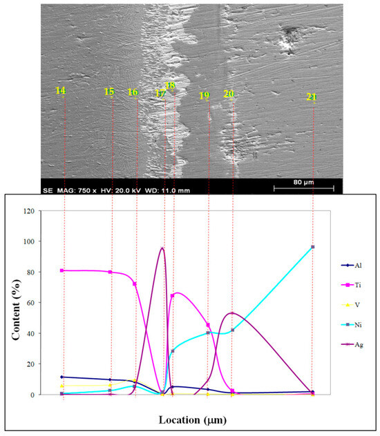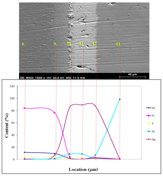 EDS, SEM, and X-ray analyses were performed to examine the mutual diffusion of nickel, titanium, aluminum, and vanadium atoms at both sides of interfaces. The results are shown in Figure 10 for a process temperature of 950 °C. The quantities of Ni at 8–13 µm from the Ti6Al4V side surface were measured at 850, 900, and 950 °C. Once more, at 850, 900, and 950 °C, Ti, Al, V, and Ag elements departed from the interface at the nickel composite at a distance of 8–13 µm. It showed that when welding temperatures rose, so too did the mutual migration and diffusion of Ni, Ti, Al, V, and Ag atoms.