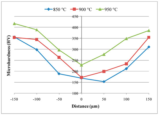 Microhardness graphic of the specimens N1 (850 °C), N2 (900 °C), and N3 (950 °C).