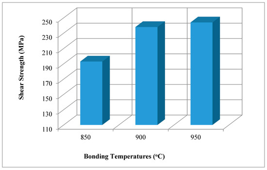In the lap-shear test of Ti6Al4V/Ni samples, the strongest shear strength was obtained as 244 MPa at a temperature of 950 °C and a time period of 60 min. As shown in Figure 10, the shear strength increased with the increase in temperature. The shear strength of the samples that were bonding at 850 °C were low. The reason for this is the low temperature applied to the samples during assembly. Due to insufficient temperature to cause deformation on the contact surfaces, sufficient contact could not be achieved, and this resulted in the formation of a weak bond in the intermediate region. The shear strength of the samples joined at 900 °C is slightly higher than that of the samples joined at 850 °C. This increase in the shear strength can be explained with the increased temperature that presented high contact surface force and mutual increase in the diffusion amounts of the elements. The reason why higher strength was achieved at 950 °C, compared to other temperatures, can be said to be the increase in temperature, surface deformation, and diffusion. Moreover, the increased incorporation of nickel into silver explains the presence of a silver-rich solid solution for shear deformation and higher nominal nickel concentrations [37].