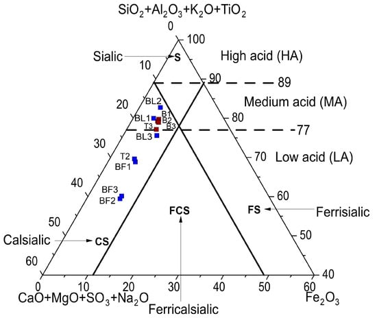 Analyzed ash samples compared to Vassilev’s chemical classification of the inorganic matter in coal ash [58]. Explanations: blue symbol—fly ash, brown symbol—bottom ash.