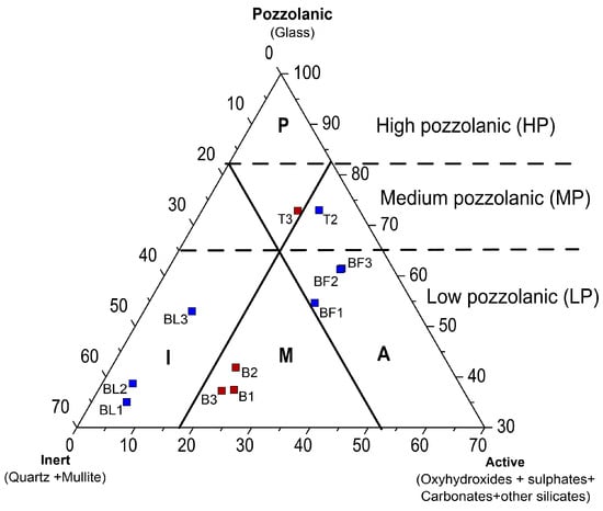 The phase composition of the tested ashes was compared with the Vassilev phase mineral classification system [58]. On this basis, BA from Bełchatów was classified as mixed–low pozzolanic (M-LP), and the BA from Turów as pozzolanic–medium pozzolanic (P-MP). FA from the gas duct was also classified as inert–low pozzolanic (I-LP), FA from the electrofilter as active–low pozzolanic (A-LP), and FA from Turów as active–medium pozzolanic (A-MP) (Figure 2).