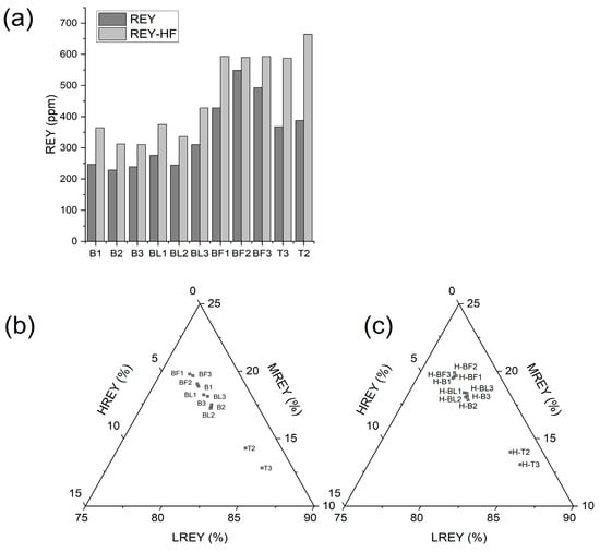 REY distribution in the tested samples: (a) the REY content of raw ash and residue samples dissolved in 4% HF; content of HREY and MREY; (b) percentage share of LREY, MREY, and HREY in raw ash; (c) percentage share of LREY, MREY, and HREY in residue samples after dissolution in 4% HF.
