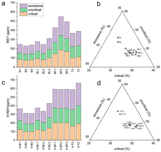REY distribution in the tested samples: (a) content of critical, uncritical, and excessive elements in raw ash; (b) percentage share of uncritical and excessive elements in raw ash; (c) content of critical, uncritical, and excessive elements in residue samples after dissolution in 4% HF; (d) percentage share of uncritical and excessive elements in residue samples after dissolution in 4% HF.