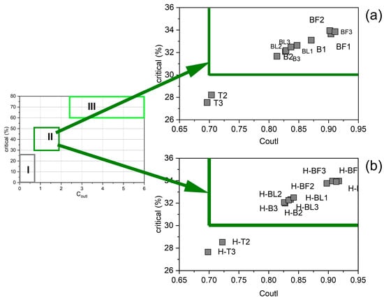 The relationship between the percentage share of critical elements and the Coutl prospective coefficient compared to the classification of coal ashes enriched in REE [3] (a) in raw ash samples and (b) in residue samples after dissolution in 4% HF. Source of REY: I—not prospective; II—prospective; III—highly prospective source of REY.
