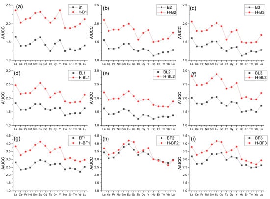 Distribution of REY content in the tested ash samples from Bełchatów power plant. The share of REY was normalized to their content in the UCC [59]. Explanation: black curve—raw sample, red curve—residue sample. (a–i)—sample symbols in the upper right corner.