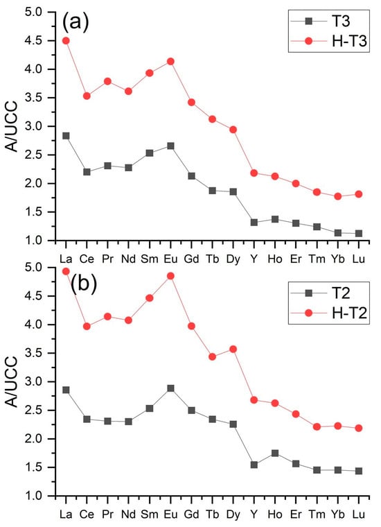 Distribution of REY content in the tested ash samples from the Turów power plant. The share of REY was normalized to their content in the UCC [59]. Explanation: black curve—raw sample, red curve—residue sample. (a,b)—sample symbols in the upper right corner.
