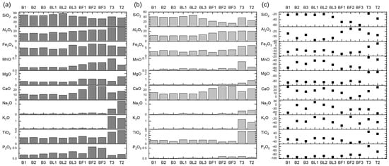 Comparison of the contents (%) of the main chemical components in (a) the raw ashes and in (b) the ash after 4% HF treatment; (c) enrichment or removal efficiency in (%).