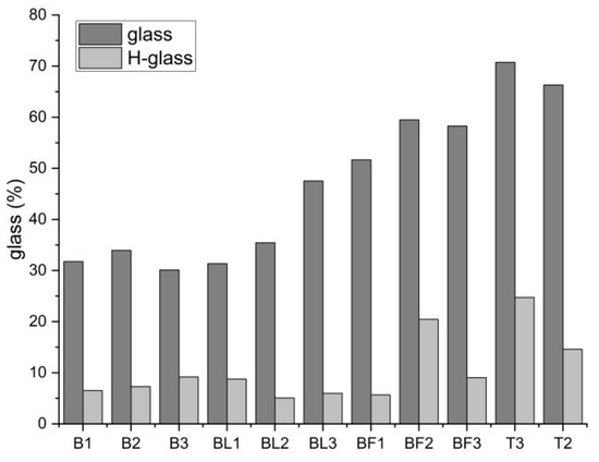 The results showed that the glass content was lower than in the raw samples and usually did not exceed 10% in ashes from B. In the case of ashes from Turów, their content ranged from 14.61 to 24.73%, but the amount of glass in these samples was the highest of all samples analyzed (>65%). In summary, the glass removal efficiencies in the tested ashes ranged from 65.04% to 89.01% (Table 6, Figure 9).