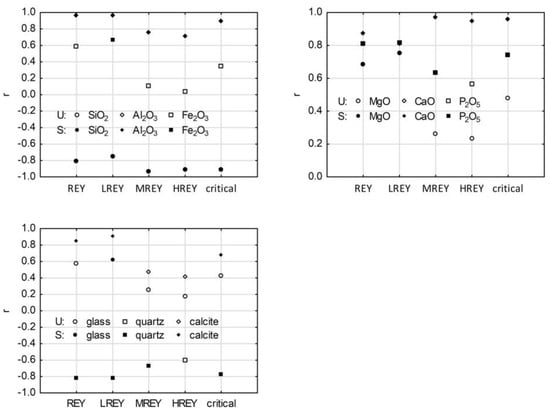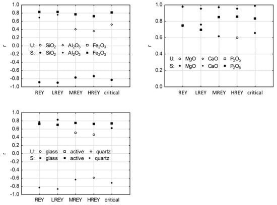 Values of correlation coefficients for relationships between the contents of REY, LREY, MREY, HREY, and critical elements and the contents of some chemical components and phases in the tested raw ash. Explanations: U—unsignificant correlation, S—significant correlation.
