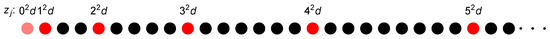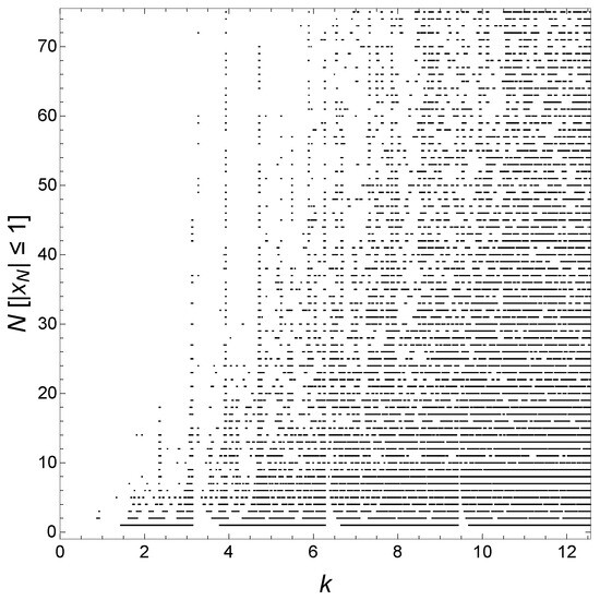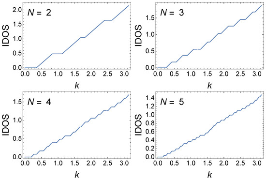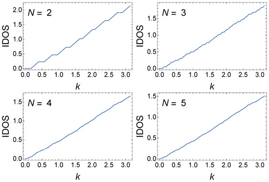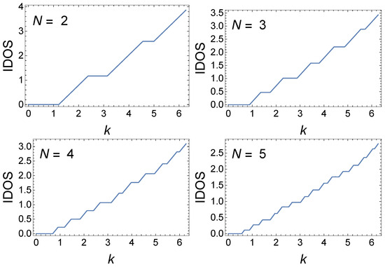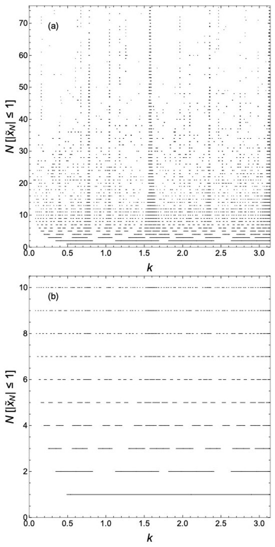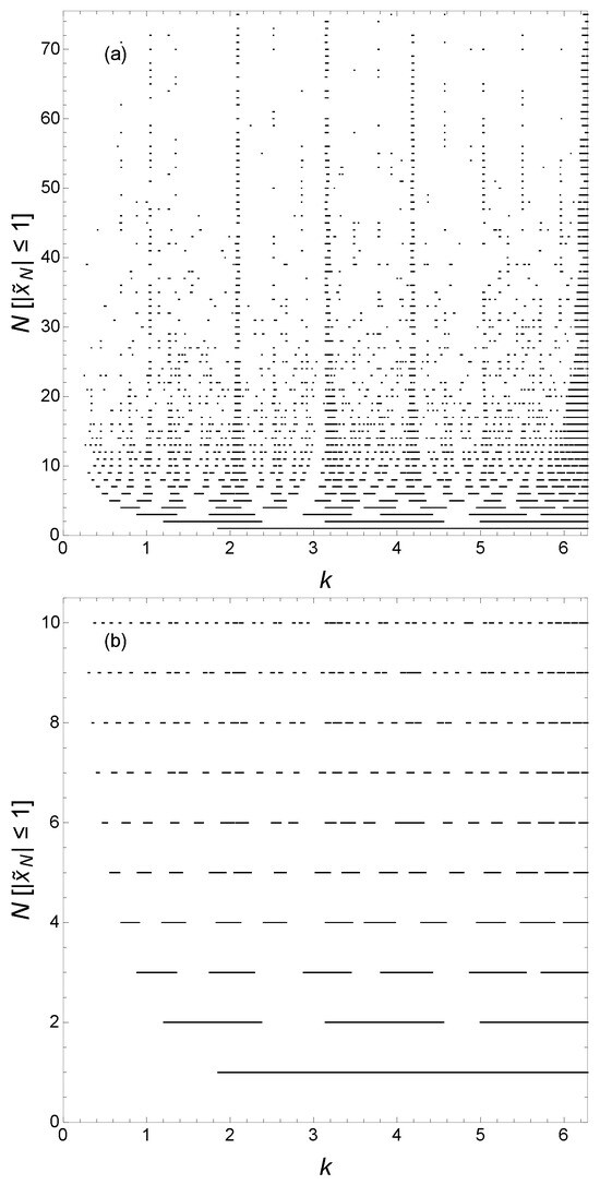 In contrast, for (only results for are presented here), the structure seen in the evolution of the minibands and gaps with increasing N is visually not evident compared with that for . We find that the transfer matrix exhibits a k-dependent translational invariance for all GCs; however, the origin of the difference between the GC and the generalized quadratic GC studied here and GCs with can be hinted at by a RSRG technique whereby the transfer matrix for an -site GC is generated from the transfer matrix for an N-site GC. The iterative, bottom-up RSRG approach for computing the half-trace of the transfer matrix is presented for an N-site quadratic GC and for the specific generalized quadratic GC . The approach, which does not work for or any other case, reveals a self-similar structure to the transfer matrix for the GC, as well as for the generalized quadratic GC.