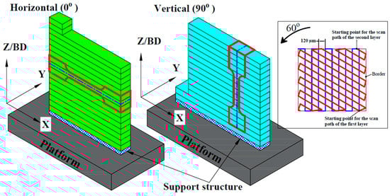 Schematic drawing of 3D specimens during manufacturing process with different building orientations. The laser track was rotated by 60° after each layer.
