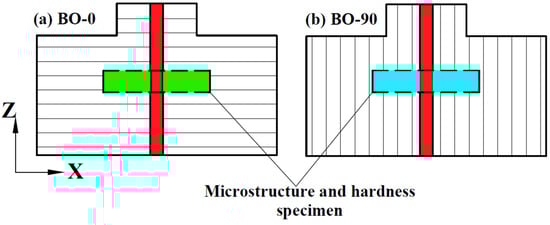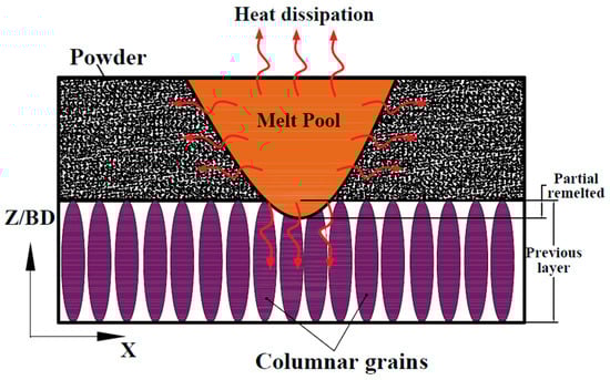 Figure 8 illustrates the heat dissipation resulting from the melting of powder during the LPBF printing process, as described in the literature [36,37]. The columnar grains formed throughout the layer were aligned with the building direction and perpendicular to the fusion path/layer boundary in the direction of the source of energy, as discussed in the solidification of LPBF in [46,47]. During the printing process, the heat dissipation (highlighted by red arrows) from the fusion pool occurred in the direction of columnar grain initiation from the previous layer, which accelerated the heat dissipation and cooling rate. The higher cooling rate led to a smaller grain size, thereby enhancing strength and resistance to indentation (hardness properties). This is consistent with the microstructure of the BMs in Figure 3, where the grain size of BO-0 was smaller than that of BO-90.