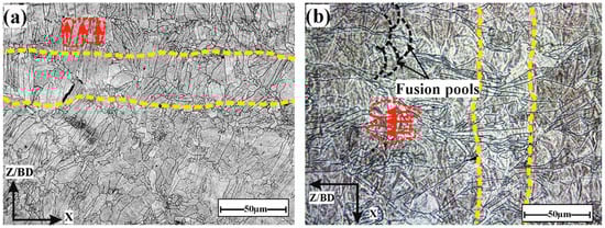 Microstructure of base metal with different building orientations: (a) BO-0 and (b) BO-90. The orientations of the columnar grains are highlighted with red dashed lines, and the layer boundaries are highlighted with yellow dashed lines.