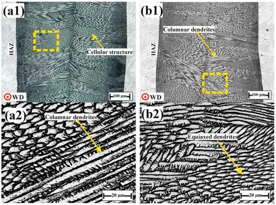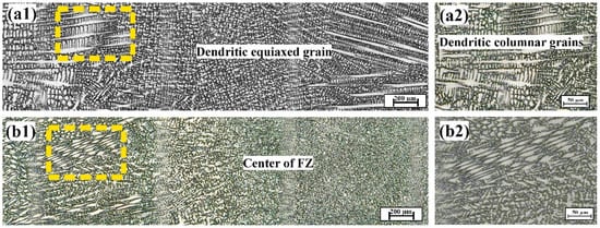 Microstructure images of the FZs produced by TIG welding for specimens with different welding directions, as follows: (a) BO-0 and (b) BO-90. (1) General views of FZs and (2) magnified views (highlighted with yellow dashed lines) of dendritic columnar grains.