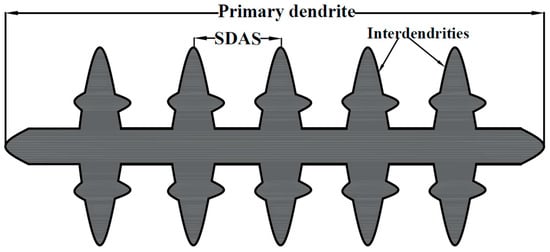 Figure 5 illustrates the characteristics of dendrites formed in the FZ. At a lower cooling rate, grains had sufficient time to grow significantly, leading to increased dendrite length and interdendritic spacing. Consequently, this resulted in a reduction in indentation resistance, as reflected by the lower hardness values [41]. Olympus stream motion image processing software 2.5.2 was used to measure the dendrite length (primary length) and interdendritic spacing (secondary dendrite arm spacing, SDAS). The line extending from the center of the first dendrite to the center of nth dendrite. This was determined using Equation (4), as follows [42,43]:
