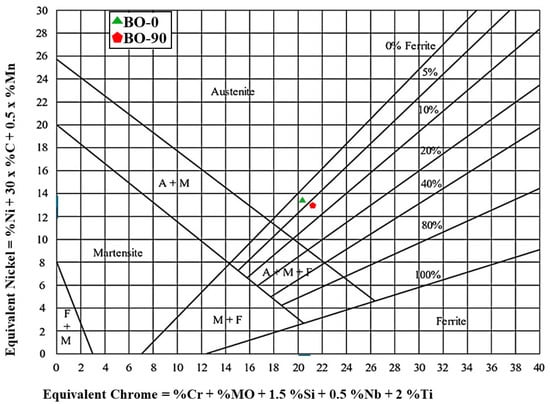 Figure 6 illustrates the Schaeffler diagram used to predict the delta ferrite content in FZs, based on the chemical composition of the BM (presented in Table 1) and the welded joints (presented in Table 6). The BO-90 samples exhibited a higher delta ferrite content (6%) compared to the BO-0 samples (3%). Additionally, the ferrite scope measured volume fractions of delta ferrite of 1.9 ± 1.1and 4 ± 0.3% in the BO-0 and BO-90 joints, respectively.
