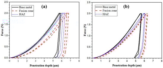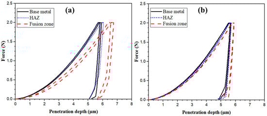 Load–penetration depth of micro-indentation hardness of laser-welded joints: (a) BO-0and (b) BO-90.