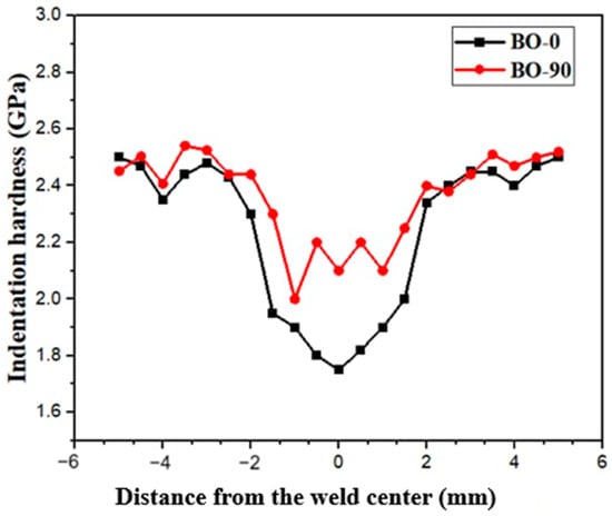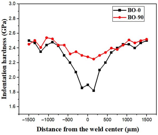 Figure 11 shows the micro-indentation hardness curves of the laser-welded joints. The HIT values and the corresponding penetration depths are presented in Table 8. In the FZ, the indentation resistance of the laser-welded joints was higher than that of their counterparts, the TIG-welded joints. Notably, the indentation resistance in the FZ of the BO-90 specimens had the highest recorded value at 2.35 ± 0.11 GPa, surpassing that of the BO-0 specimens, which was 1.9 ± 0.16 GPa. This finding aligns with the greater cooling rates observed in BO-90 specimens and is consistent with the hardness results of the TIG-welded joints.