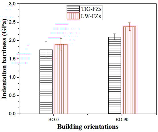Additionally, with the increase in the building orientation of the BM from 0 to 90°, the hardness values of the FZs were increased in both techniques. This is attributed to the higher cooling rates in BO-90 specimens, since the welding path is parallel to the printing direction of BO-90 specimens, resulting in greater heat dissipation after welding processing. Therefore, BO-90 displayed hardness values greater than those of BO-0 specimens.
