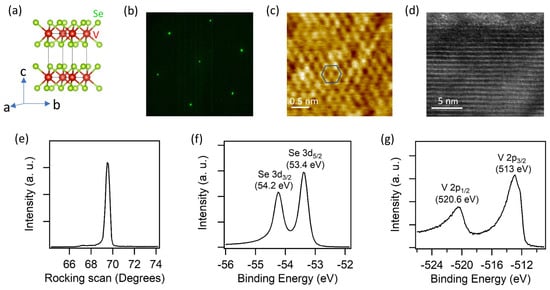 The crystal structure of 1T-VSe2 was examined through multiple techniques to confirm the high quality of the samples and consistency with earlier studies. A ball–stick representation of the atomic structure is shown in Figure 1a. 1T-VSe2 crystallizes with an in-plane hexagonal geometry as shown in µLEED and STM images given in Figure 1b,c. Both data indicate the presence of a single domain phase without extra diffraction spots or other in-plane atomic arrangements. A representative high-resolution transmission electron microscope (TEM) image further confirms the layered structure along the c-axis of the crystal with well-defined atomic layers and smooth interfaces between the monolayers (Figure 1d). XRD data in Figure 1e assign the in-plane and out-plane lattice constants of 3.354 and 6.097, respectively, in excellent agreement with the earlier reports [5]. The rocking curve of the high-quality single crystal was 0.4 degrees full width at half maximum with negligible secondary crystal grains. Finally, the chemical environment of the sample was probed by Se 3d and V 2p core-level spectra, which showed no additional spectral features beyond the spin-orbit splitting components (Figure 1f,g). The binding energies corresponded to −2 and +4 oxidation states for Se and V atoms, which is consistent with a single chemical phase in the material [20].
