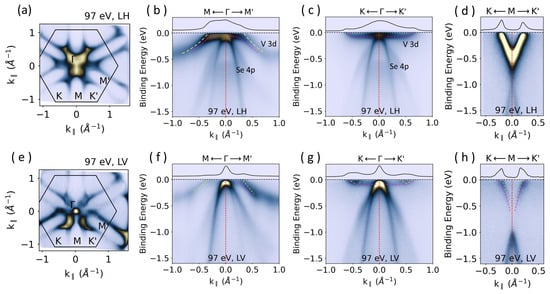 The surface electronic structure of a 1T-VSe2 bulk sample is shown in Figure 2 for LH (upper panel) and LV (lower panel) polarized lights. The LH Fermi surface exhibits ellipsoidal pockets centered at the M() points and an intense spectral feature in the zone center due to Se 4p-atomic orbitals (Figure 2a). The electronic structure along the M–– direction looks identical to the previous reports [8,9,10,11,12,13,14,15,16,17,18]. However, the Fermi level momentum distribution curve (MDC) given above the spectrum shows weak shoulders, indicating the presence of two distinct bands close to the Fermi level (see dashed pink and yellow lines in Figure 2b). One, resembling the band structure calculations [17,18], bends into a flat dispersion towards the -point and overlaps with the Se 4p-derived bands. The other instead continues the upward dispersion, crossing the Fermi level before reaching the center of the zone. Here, the former is the topological surface state of which the details can be found in Reference [19].