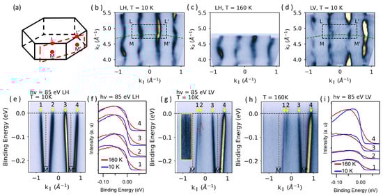 (a) Schematic representation of the 3D Brillouin zone. (b,c) Fermi surface sections along the plane (see panel (a)) probed with LH light polarization at 10 K and 160 K, respectively. (d) Same as (b) but with LV polarized light. Green dashed arcs in (b,d) correspond to 85 eV photon energy. (e) ARPES spectrum taken along the – direction at 10 K with LH polarized light. (f) EDCs taken at 10 K (blue) and 160 K (red) at k‖ marked with yellow arrows and number labels in (e). (g,h) ARPES spectra along the – direction taken with LV light polarization at 10 K and 160 K, respectively. (i) EDCs taken at 10 K (blue) and 160 K (red) at k‖ marked with yellow arrows in (g,h). Red arrows in (g) mark the multiple bands. The yellow rectangle highlights an area where the color has been saturated to make the bands visible.