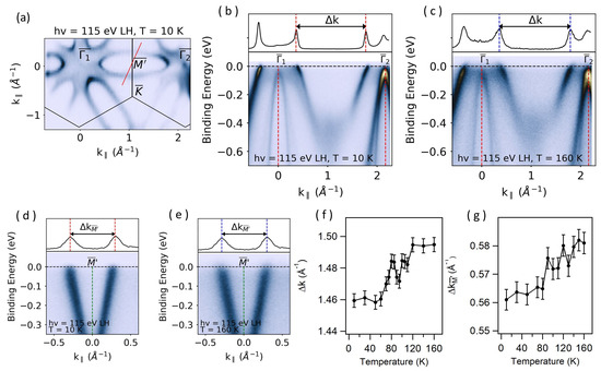 The detailed band structure characterizations given above convincingly demonstrate that the previous observations stem from multi-band crossing of the Fermi level rather than the CDW phase transition. This implies that the impact of the structural distortion on the electronic structure of 1T-VSe2 remains an open question. On the other end, although the Fermi surface does not display gaps and nesting based on the ARPES experiments, transport measurements show clear anomalies around 110 K [21,22,23,24]. In some cases, structural transitions can cause modifications of the Fermi surface area [25,26,27,28]. Therefore, it seems sensible to investigate the size of the ellipsoidal electron pockets centered at the point as a function of temperature. A Fermi surface portion covering two Brillouin zone centers is given in Figure 4a. Here, two relevant quantities are k, measuring the distance between the ellipsoidal pockets along the – direction, and , measuring the size of the pocket along the red line shown in Figure 4a. Representative spectra below and above T* are given in Figure 4b–e), where k and are also marked. Plots of these two quantities as a function of temperature are presented in Figure 4f,g. Interestingly, both k and undergo a sizable change across the CDW temperature, indicating a decrease in the Fermi surface area with the temperature decreasing from 160 K or 10 K. This result is in excellent agreement with the transport measurements, which show a relative increase of the in-plane resistivity across the same temperature [21,22,23]. Therefore, this finding establishes a direct connection between the electronic structure and the structural distortion in 1T-VSe2. Furthermore, a fluctuation larger than the error bars is observed in ks around 100 K. Recently, the surface electronic structure in 1T-VSe2 was shown to host topologically non-trivial surface states [19]. Therefore, the bulk band crossing the Fermi level will have a spectral contribution from these states. Topological surface states are expected to have smaller electron–photon coupling compared to the bulk bands due to their localization in the surface region. Therefore, the sudden changes in k could be related to this difference, although the direct correlation is not clear at this point.