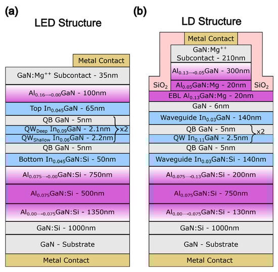 As we explained in our previous work [], the electron blocking layer (EBL) is Mg-doped to improve the injection efficiency of this device. In the LED structure, a staggered quantum well is used. This method is common in high-In-content structures to improve the overlap of an electron and hole wavefunctions [,]. However, the benefit is negligible for low-In-content QWs (blue and shorter wavelengths). In an LD structure, we decided to use the simpler, classical rectangular quantum well. The difference in the quantum well design between the LED and the LD is not related to the studies within this paper and should not influence the conclusions in any way.