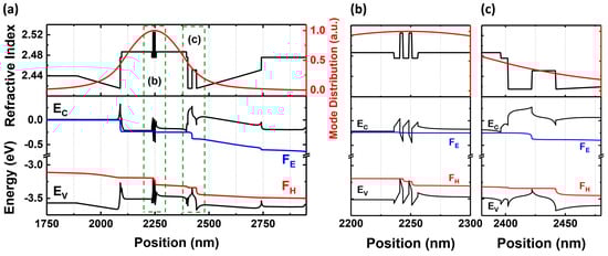 Energy − band diagram (@ 3.5 V) and refractive index of the laser structure (a) zoomed at an active area (b) and EBL area (c). The regions corresponding to (b,c) are marked by green dashed rectangles in the picture (a). Vertical axes are identical for all graphs.