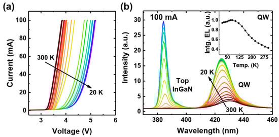 First, we would like to demonstrate the performance of the polarization-doped LED. We performed continuous operation temperature-dependent spectral and I–V measurements between 300 K and 20 K, which are given in Figure 3. The LED successfully operated even at 20 K. The operating voltage increased with decreasing temperature, e.g., for 100 mA from 3.9 V (300 K) to 5.2 V (20 K), as shown in Figure 3a. This change is probably related to the partial freezing-out of acceptors in the subcontact layer. However, due to the self-heating in this area of the sample, there is still a considerable amount of acceptors ionized, allowing for the electrical injection and operation of the device.