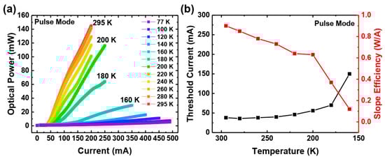 Pulsed current was employed to mitigate device heating from Joule heating (self-heating). This is crucial because, at cryogenic temperatures, the cryostat’s cooling capacity can approach the energy dissipation within the device. For our experiments, we utilized the ILX Lightwave LDP3811 Precision Pulsed Current Source, which provided 200 ns pulses at a 1 kHz repetition rate, resulting in a duty cycle of 0.02%. Our experience suggests that, for such short pulses and small duty cycle, the self-heating effect becomes negligible. The temperature-dependent measurement results are presented in Figure 4.