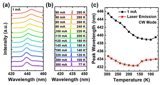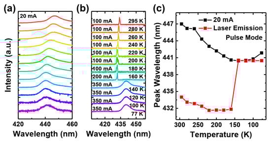 We observed that the behavior of the wavelengths of lasing and spontaneous emission is similar. In the case of lasing, we saw a small red shift of emission at temperatures below 140 K, which can be associated with higher drive currents, resulting in higher junction temperatures. However, this effect is relatively small. The boundary between the two different regions appears at 150 K, which is similar to the jump observed in Figure 5c for laser emission.