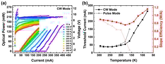 Figure 6 presents a temperature-dependent CW operation of the same laser diode. As a similar pulse mode measurement, the slope efficiencies are calculated by using an almost all current-light (L-I) value above the threshold current. There is less non-linearity when it is compared with pulse mode results. The device lases across the entire registered temperature range, i.e., down to 77 K, albeit at the expense of increasing the threshold current and operating voltage. The threshold current increases from 46 to 264 mA, and the operating voltage at 100 mA increases from roughly 5.7 V up to 9.1 V. Additionally, after 160 K, we observed a negative differential resistivity, which is visible as a voltage drop in Figure 6a. Such behavior is usually associated with the existence of potential barriers for carrier injection. We tend to associate this barrier with potential spikes in the valence band at the position of the EBL. This barrier may increase, while the quasi-Fermi level in the EBL rises with decreasing temperature.