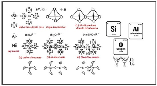 Geopolymers are inorganic and amorphous aluminosilicate polymers that constitute a viable alternative to products typically manufactured from Portland cement. The properties of geopolymer materials are primarily dependent on the type of base material (predominantly waste from the energy or mining industries) and the alkali activator utilized [1,2,3]. The formation of geopolymers occurs through the process of polycondensation, wherein [SiO4]4− and [AlO4]5− tetrahedra interconnect at their vertices, resulting in the development of amorphous or subcrystalline three-dimensional aluminosilicate structures, which exhibit structural similarities to zeolites [4,5]. This process is shown in Figure 1.