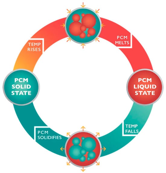 Thermal energy storage (TES) materials utilize latent heat. Their distinctive property enables heat storage, and their operation is predicated on exploiting the heat of phase transitions in various systems, such as liquid–solid transitions. This group of materials is generally classified as phase-change materials (PCMs). As the phase-change process is, depending on the direction of the transformation, an exothermic or endothermic process, these materials can be effectively employed for energy accumulation and dissipation [34,35]. Figure 2 illustrates a schematic representation of the operational mechanisms of these materials [36].