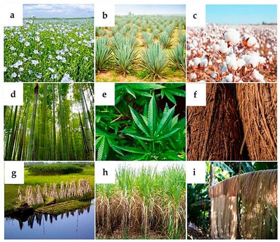 Fibers of natural origin: (a) flax, (b) sisal, (c) cotton, (d) bamboo, (e) hemp, (f) coconut, (g) jute, (h) sugar cane, (i) banana.