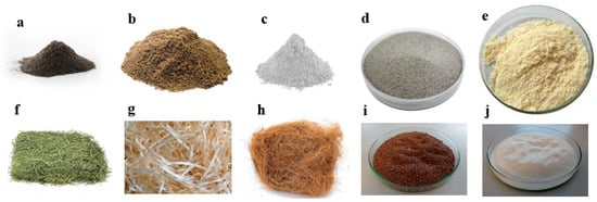 Materials used for the fabrication of the samples (a–e) and additives (f–j): (a) fly ash, (b) sand, (c) cement, (d) fly ash microspheres, (e) Syringaldehyde, (f) hay, (g) wood shavings, (h) coconut fibers, (i) GR42, (j) PX25.