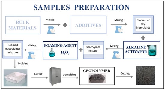 Diagram of geopolymer foams manufacturing. Indication of the various processes from multi-step mixing of ingredients to curing and sample molding.