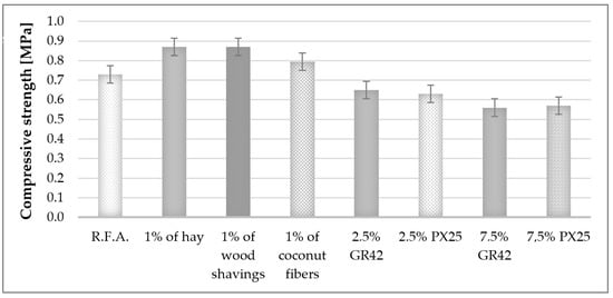 Compressive strength of samples with the addition of natural fibers and phase-change materials. Confirmation of the positive effect of fiber addition on compressive strength.