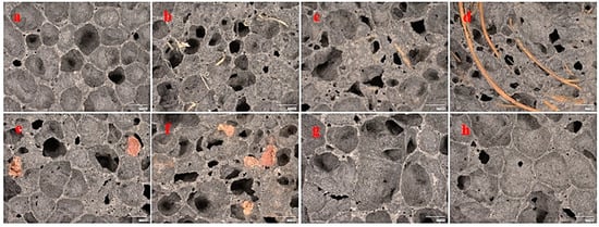 Porous structure morphology: (a) reference fly ash, (b) 1% of hay, (c) 1% of wood shavings, (d) 1% of coconut fibers (e) 2.5% GR42 (f) 7.5% GR42 (g) 2.5% PX25 (h) 7.5% PX25.