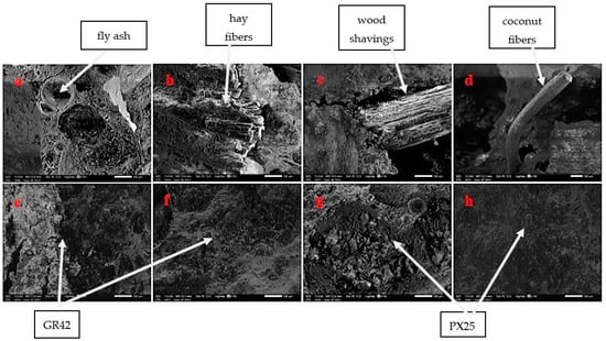 Microstructure of the sample: (a) reference fly ash, (b) 1% of hay, (c) 1% of wood shavings, (d) 1% of coconut fibers (e) 2.5% GR42 (f) 7.5% GR42 (g) 2.5% PX25 (h) 7.5% PX25.