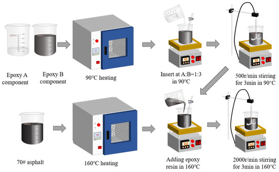 EA is made by mixing epoxy resin and asphalt evenly in a particular proportion. The preparation process was as follows: (1) In an oven at 90 °C, heat the epoxy resin components A and B to soften them. (2) combine the epoxy A and B components in a beaker at a 1:3 mass ratio. (3) Stir the epoxy resin with a stirrer (500 rpm) for 3 min at 90 °C. (4) Heat the bitumen at 160 °C. (5) Pour the epoxy resin in the 10%, 20%, 30%, 40%, and 50% ratio into the bitumen beaker at 160 °C. (6) Stir the EA with a stirrer (2000 rpm) at 160 °C. The flow chart of epoxy-modified asphalt preparation is shown in Figure 3.