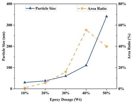 The particle size of the EA particles was determined using an image analysis program (ImageJ 1.45) and statistically analyzed for epoxy particle size and area ratio. The results are shown in Figure 6. The epoxy resin dosage was increased from 10% to 40%, and the epoxy resin particles were increased from 30 microns to 140 microns. From 40% to 50%, the epoxy resin particle size increases sharply from 140 µm to 440 µm. In addition, the epoxy resin particle area increases from 3% to 60% when the epoxy resin is used from 10% to 40%. However, when the epoxy resin dosage reaches 50%, the epoxy resin particle area decreases to 42.9%. This difference is because the proportion of epoxy resin in the EA gradually increases, the epoxy resin undergoes an aggregation phenomenon during the reaction process, and the diameter of the particles increases sharply. However, the area ratio of the epoxy resin decreases. Therefore, the epoxy particles will be uniformly dispersed in the bitumen when the dosage of epoxy is 40%. During the curing reaction of epoxy resins, crosslinking and polymerization reactions occur between the unsaturated double bonds of the epoxy molecular and the double bonds of the curing agent. The linear long-chain molecules form chemical bonds and crosslink into a three-dimensional network structure [6,24]. With increased epoxy resin doping, the three-dimensional network structure gradually becomes larger.