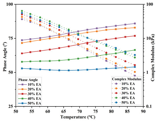 In this study, EA’s mechanical properties were analyzed using a dynamic shear rheometer with temperature scans from 52 °C to 88 °C. The results are shown in Figure 8. EA’s phase angle (δ) grows, and the complex modulus (G*) declines with rising temperature. This is due to the transition of EA from a highly elastic state at low temperatures to a viscous flow state at high temperatures. EA’s maximum shear stress reduces, and its maximum shear strain grows, so G* decreases. Meanwhile, δ of EA is enhanced with rising temperature, which increases EA’s viscous component. Because the space structure formed by the epoxy resin increases the elastic component in the EA, resulting in a decrease in its δ. Moreover, EA’s G* gradually increases when the epoxy resin content is 10–40%. However, with 50% epoxy resin, the G* is lower than 40% EA at lower temperatures and gradually rises above 40% EA with increasing temperatures. As the dosage of epoxy resin increases, the EA content of the asphalt light component also increases, resulting in a decrease in G*. With increasing temperature, EA’s high-temperature deformation resistance has a progressively greater influence, and its G* decreases continuously.