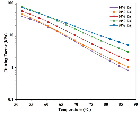 To better identify the effect of EA dosage on asphalt rheological characteristics, introduce the rutting coefficient (G*/sinδ) as EA’s evaluation index of anti-temperature rutting performance. The result is shown in Figure 9. G*/sinδ reduces with temperature elevation and is larger with EA dosage. It indicates that EA’s rutting resistance continues to decline with increasing temperature. However, 40% EA has a higher rutting coefficient than 50% EA at low temperatures. In conclusion, adding epoxy resin can substantially improve EA’s high-temperature rheological properties. Although 50% EA has the best high-temperature rutting resistance, 40% EA has better high-temperature deformation resistance and viscoelastic properties, which can be regarded as 40% EA having the best high-temperature rheological properties.